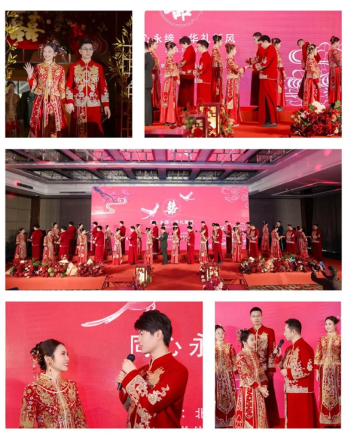 伴随着悠扬国乐,新人身着喜庆夺目的红色中式婚服,在至亲好友的见证下,许下“相守一生、白头偕老”的幸福承诺,场面庄重而温馨。“风雨同行,为爱不离不弃;相知相守,共建和美家庭。”新人们共同发出婚姻誓言,传递了他们相信爱情、追求幸福、坚守婚姻的积极健康向上的婚恋观。“我们愿以实际行动支持喜事新办简办,希望更多人树立简朴、健康的婚俗新风。”在庄重朴素的中式婚典中,新人们以实际行动践行着婚事新办简办的新风尚,诠释了文明之风、简约之美,是对高价彩礼、大操大办的自觉抵制,倡扬了新型婚育文化新风。