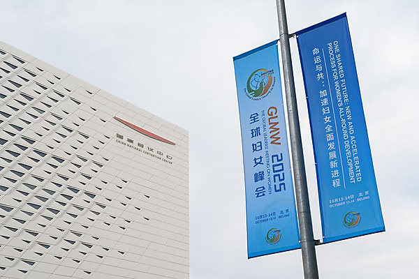 Street banners for the Global Leaders' Meeting on Women are pictured in Beijing, capital of China, on Oct. 11, 2025. [Xinhua/Ju Huanzong]