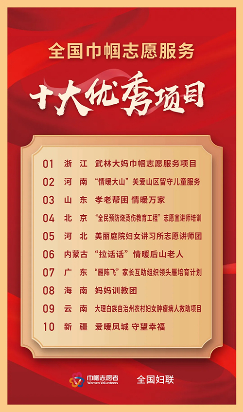 近年来,全国妇联深入落实党中央关于志愿服务的决策部署,在中国特色志愿服务大局中努力发挥巾帼志愿服务优势,以“立足社区、面向家庭、扶危济困、守望相助”为宗旨,大力推进巾帼志愿服务发展,在党的创新理论宣传宣讲、脱贫攻坚、疫情防控、防汛救灾、文明实践、关爱女童、助老帮困等方面涌现出了一大批感人至深的巾帼志愿服务典型,此次评选出的十大感动人物、十大暖心故事和十大优秀项目就是其中的优秀代表。