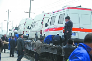 图为专业及保障车辆4月21日中午通过火车专列运往灾区。