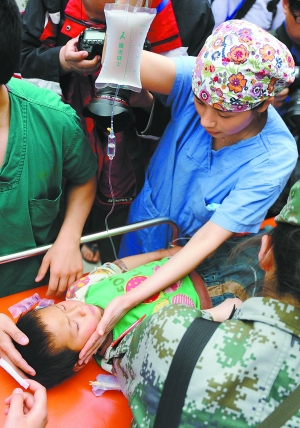 4月21日,医务人员在芦山县人民医院安抚一名5岁的小伤员。