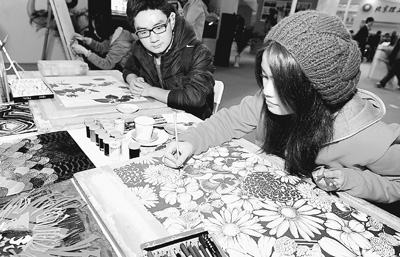 11月21日,在为期4天的第五届中国北京国际文化创意产业博览会上,北京服装学院服装专业的学生在现场进行印花产品的制作。(记者 李维娜摄)