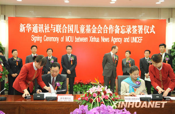 5日上午,新华社负责人和联合国儿基会代表在京签署了合作备忘录,双方达成共识:以庆祝《儿童权利公约》颁布20周年为由,联合世界各国和地区媒体于11月20日前后围绕儿童权利保护在全球范围进行一系列公益活动和新闻报道。双方表示,在全球范围内开展促进儿童权益保护,促进儿童健康成长的公益活动和新闻报道,是为了提高公众对儿童权益的认知,促进国际社会给予儿童更多的关注,承担更大的社会责任。