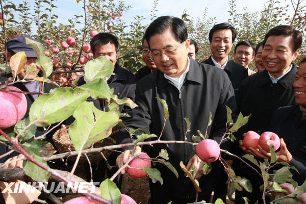 2008年10月29日至31日,中共中央总书记、国家主席、中央军委主席胡锦涛在陕西省安塞县调研和指导深入学习实践科学发展观活动。这是胡锦涛在安塞县沿河湾镇方塔村苹果园同果农们一起摘苹果,分享丰收的喜悦。 新华社发
