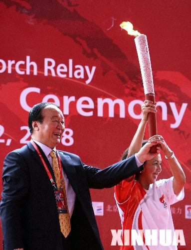 4月22日,北京奥运会火炬接力运行团队总指挥、北京奥组委执行副主席蒋效愚(左)将火炬交给印尼奥林匹克委员会主席丽达?苏博沃。当日,北京奥运会圣火传递活动在印度尼西亚雅加达举行。这是北京奥运会圣火境外传递的第十四站。 新华社记者张军摄