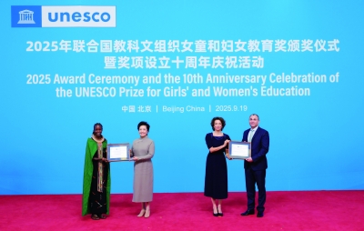 9月19日下午,2025年联合国教科文组织女童和妇女教育奖颁奖仪式暨奖项设立十周年庆祝活动在北京举行,国家主席习近平夫人、联合国教科文组织促进女童和妇女教育特使彭丽媛同联合国教科文组织总干事阿祖莱共同出席并致辞。