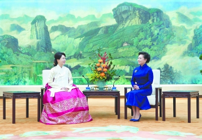 1月5日下午,国家主席习近平夫人彭丽媛在北京同韩国总统夫人金惠景茶叙。