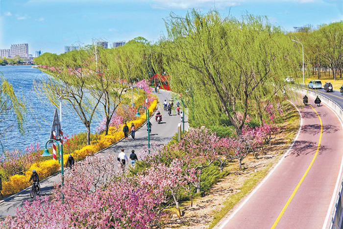 北运河新堤路与绿道如彩练铺展。骑行者穿梭花荫,车流有序穿行,尽显春日京城的盎然生机与生态之美。本报记者 方非摄