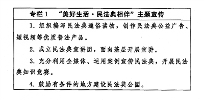 广泛开展民法典普法工作,阐释好民法典中国特色社会主义的特质,阐释好民法典关于民事活动平等、自愿、公平、诚信等基本原则,阐释好民法典关于坚持主体平等、保护财产权利、便利交易流转、维护人格尊严、促进家庭和谐、追究侵权责任等基本要求,阐释好民法典一系列新规定新概念新精神。推动各级党和国家机关带头学习宣传民法典,推动领导干部做学习、遵守、维护民法典的表率,提高运用民法典维护人民权益、化解矛盾纠纷、促进社会和谐稳定的能力和水平。把民法典纳入国民教育体系,加强对青少年民法典教育。以“美好生活·民法典相伴”为主题,组织开展民法典主题宣传,让民法典走到群众身边、走进群众心里。