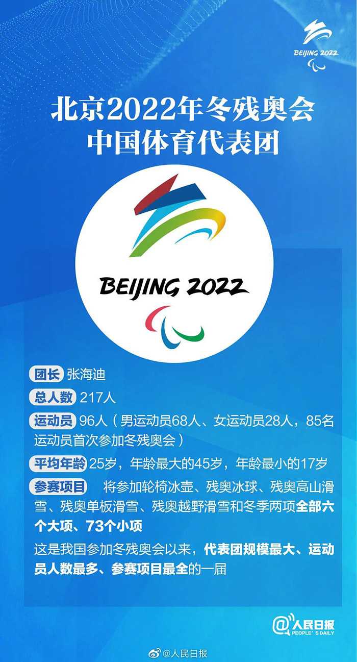 北京冬残奥会将于3月4日至3月13日举行,96名中国选手将亮相。不向命运屈服,勇敢挑战极限,残奥运动员们值得更多关注和掌声。北京冬残奥村2月25日开村,为残奥运动员们加油!有梦想谁都了不起!