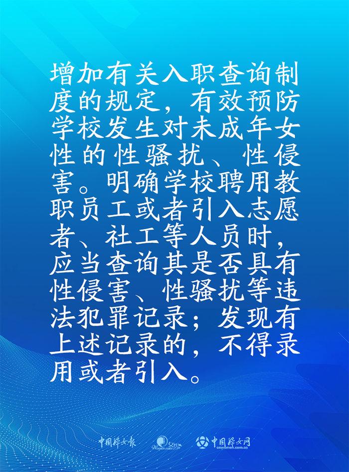 ● 三是,增加有关入职查询制度的规定,有效预防学校发生对未成年女性的性骚扰、性侵害。明确学校聘用教职员工或者引入志愿者、社工等人员时,应当查询其是否具有性侵害、性骚扰等违法犯罪记录;发现有上述记录的,不得录用或者引入。