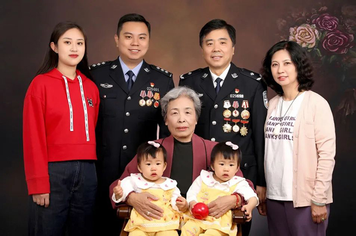 朱蓬一家庭三代从警。朱蓬一于2011年参加公安工作,穿上警服的那天,父亲朱宏送给他一句话:“穿上警服不一定就是合格的警察,得经过千锤百炼。做合格的警察,要先学会做人,再学会做事。”这也是当年朱蓬一的爷爷送给朱宏的话。如今接力棒已经交到朱蓬一的手上,这是生命延续的力量,是代代相传的希望。党的二十大安保期间,朱蓬一发扬“钉钉子”精神,连续作战,以“细致、精致、极致”的工作态度,确保各项工作万无一失,得到领导及同事的一致认可。作为双胞胎妈妈妻子王冉毫不犹豫地承担起警嫂这份责任,这个幸福美满的家庭成为朱蓬一的强大后援。