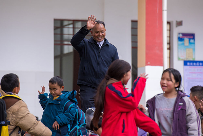 2025年2月18日,在落松地小学,农加贵(中)下课后和学生挥手告别。(彭奕凯 摄)