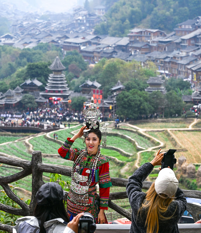 游客在贵州省黎平县肇兴侗寨观景台留影(2025年12月20日摄)。(杨文斌 摄)