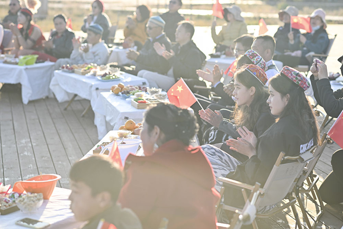 江苏泰州援疆干部人才与昭苏农牧民家庭代表齐聚,观看节目(2025年10月6日摄)。(胡虎虎 摄)