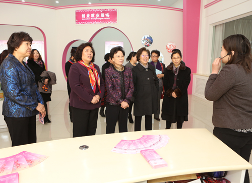 领导一行首先参观了北京巧娘手工艺作品展示区。展区中展出了巧娘的“非遗”作品、入选北京礼物作品、比赛获奖作品、奥运礼品和环保创意作品等,还展出了京绣、景泰蓝、金丝彩釉、黑陶等巧娘手工艺精品。领导在现场参与了巧娘的手工艺技能展示和教授活动,称赞北京巧娘们的慧心巧手和精湛技艺走在全国前列,鼓励北京巧娘们要继续为弘扬传统文化和妇女创业就业做贡献。