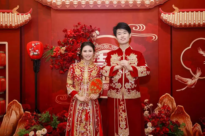 伴随着悠扬国乐,新人身着喜庆夺目的红色中式婚服,在至亲好友的见证下,许下“相守一生、白头偕老”的幸福承诺,场面庄重而温馨。“风雨同行,为爱不离不弃;相知相守,共建和美家庭。”新人们共同发出婚姻誓言,传递了他们相信爱情、追求幸福、坚守婚姻的积极健康向上的婚恋观。“我们愿以实际行动支持喜事新办简办,希望更多人树立简朴、健康的婚俗新风。”在庄重朴素的中式婚典中,新人们以实际行动践行着婚事新办简办的新风尚,诠释了文明之风、简约之美,是对高价彩礼、大操大办的自觉抵制,倡扬了新型婚育文化新风。
