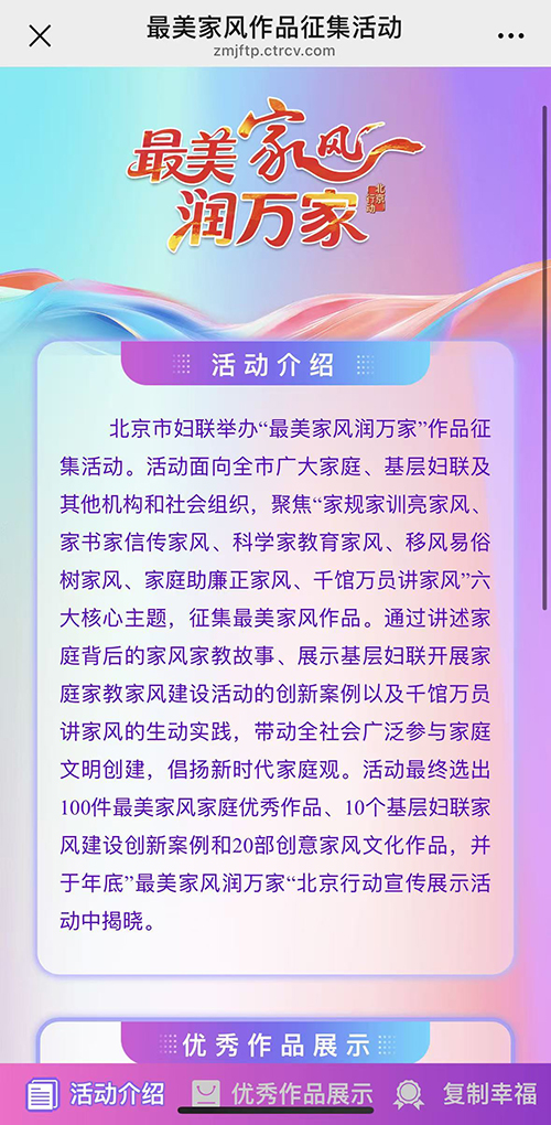 由北京市妇联主办的“最美家风润万家”作品征集活动,围绕“家规家训亮家风、家书家信传家风、科学家教育家风、移风易俗树家风、家庭助廉正家风、千馆万员讲家风”六大主题,面向全市广大家庭、基层妇联以及其他机构和社会组织,广泛征集家庭作品、创新案例和创意文化作品,累计征集各类作品2300余件。