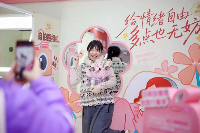 在物美玉蜓桥店,“人生四格”摄影棚前排起小长队,宣言墙上贴满了手写的心情便签,路过的市民纷纷驻足打卡留念。陈女士也与朋友分享了打卡照片,她说:“‘三八’妇女节正好想给自己一点仪式感,出门路过超市还能碰到这么好看的打卡点。宣言墙上的这些话,好多都是我自己平时想说的,亲自写下来后,感觉心情都好多了。”