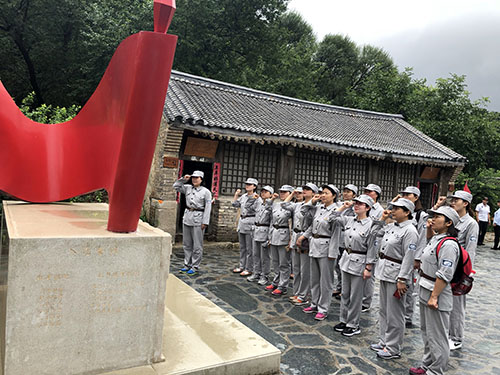 纪念馆参观结束后,全体党员在教练官的带领下冒雨向昌延联合政府旧址出发,沿着公路用双脚践行、体验革命先烈曾经走过的抗战路,感受当年抗战的不易和艰辛。在昌延联合政府旧址大家听取了战争年代当地抗日英烈用生命抗争、开辟平北抗日根据地的感人的故事。随后,全体党员面向党旗庄严地举起右手重温了入党誓词,用庄严的承诺和坚定的决心鞭策自己始终牢记共产党员的政治责任和历史使命,不忘初心,砥砺前行。