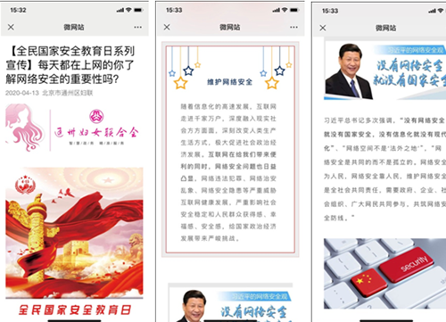 与此同时,通州区各级妇联也纷纷行动起来,以各种形式向群众宣传国家安全知识。梨园镇云景东里社区妇联开展“全民国家安全教育日”宣传活动,向辖区居民普及宣传防疫知识,宣传疫情期间居家生活安全小常识;潞城镇常屯村妇联开展线上“全民国家安全教育日”宣传活动。村妇联将“北京普法”微信公众号发布的坚持总体国家安全观、增强全民国家安全意识等相关知识转发至微信群中,妇联执委们积极在本村各微信群转发进行宣传,组织村民参与国家安全日线上有奖竞答活动;于家务乡妇联、派出所、司法所、综治办等部门联合在于家务西里社区开展了“4.15全民国家安全教育日”宣传活动。工作人员一边向现场群众发放礼品和宣传册,一边为大家普及有关国家安全日的相关知识,还不时为前来咨询的群众答疑解惑。漷县镇综治办、妇联、团委等多部门联合在全镇范围内开展了“全民国家安全教育日”宣传活动。活动通过海报张贴、网上信息宣传等形式展开。海报分别以国家安全、生物安全、公共卫生、人民安全等为主题,共计张贴500余张,覆盖了61个村、3个社区以及重点路段等,颜色醒目,起到了警示作用;梨园镇砖厂村开展“全民国家安全教育日”宣传活动。村党支部利用村大屏幕宣传,并通过现代化网上信息手段转发各类宣传文章,提请村民学习相关知识,让群众认识到“一切国家机关、武装力量、政党、社会团体、企业事业单位和公民都有保守国家秘密的义务”的重要意义。