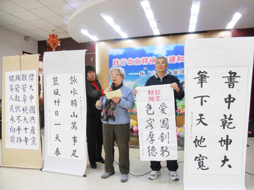 “三八”妇女节102周年来临之即,东城区前门街道妇联组织地区广大妇女开展“践行北京精神 构建和谐前门”庆“三八”家庭才艺展风采活动。70多个家庭代表通过展示家庭文化,生动地诠释了爱国、创新、包容、厚德的“北京精神”。评剧、布艺贴画、口琴合奏、夫妻双人舞等特色家庭才艺迎来阵阵喝彩,特别是王昭婉夫妻用废弃的布头制作成富有民间文化色彩的布艺贴画,既环保又美观,除了装扮自己的小家外,每逢年节时送给邻居、朋友,凝聚了邻里和谐。萧宜瑞夫妇的评剧更是不得了,每逢节假日,家庭、朋友聚会时为大家表演助兴,使家人之间多了几分亲情和融洽,春节为社区居民表演,带去欢乐,更促进了社区居民的和谐。