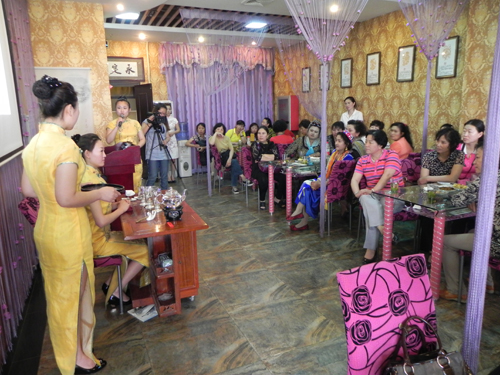 随后,考察团一行来到另一位优秀创业女性--“灵之秀茶文化有限公司”总经理张建民的茶楼。张建民向大家讲述了企业茶叶销售、茶艺服务、文化创意、旅游开发、有机农产品种植、加工、销售等为一体的综合性服务项目,黄芩、金银花等特色农产品种植,以及“举人茶”、“大村三宝”、“金银花茶”等经营情况,并请考察团成员们观看了茶艺表演,品尝了特色山茶,受到考察团成员们的一致称赞和好评。