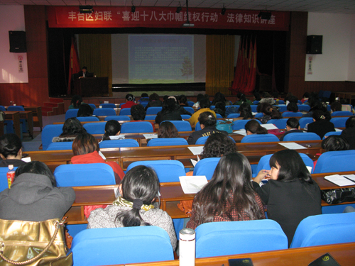 为提高基层妇联干部的接访水平,进一步营造良好的社会氛围,近日,丰台区妇联举办“喜迎十八大、巾帼维权行动”法律知识讲座,各街道妇工委、乡(镇)妇联主席、社区(村)妇女干部300人参加。