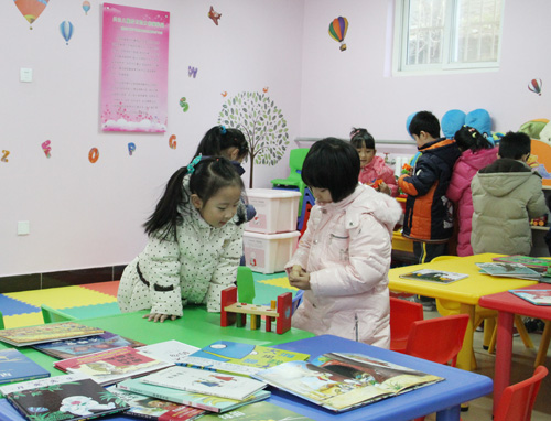孩子们在辅导站阅读室浏览绘本图书