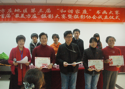 为贯彻落实党的十八大精神和丰台区十二次妇代会精神,2012年12月26日,在方庄地区妇工委组织下,第三届“和谐家庭”书画大赛、首届最美方庄摄影大赛作品展暨最美方庄摄影协会成立仪式拉开了帷幕。一幅幅装裱精美的书法、绘画作品,悬挂在雪白的墙壁上,墨宝或刚或柔,画作赏心悦目,吸引了100多名群众前来参观。