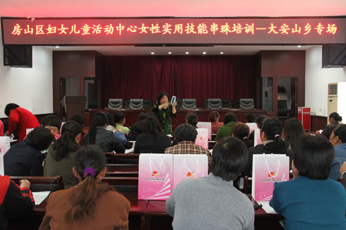 4月22日,房山区妇女儿童活动中心2013年度女性实用技能--串珠培训班房山区大安山乡专场开班。活动邀请到房山区巧姑靓嫂手工艺品商会陈新老师为山区妇女授课。通过传授串珠程序步骤、串珠技巧及注意事项,参加培训的姐妹们迅速掌握了串珠的技法,做到了学为所需、学以致用、注重实效。