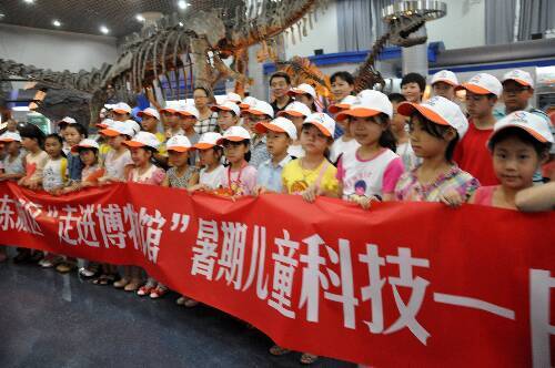 为丰富未成年人暑期生活,充分发挥东城区科技教育基地的作用,让社区贫困家庭的孩子能置身博物馆学习、感受自然科学知识,激发他们了解大自然、热爱大自然、保护大自然的意识,近日,东城区妇联、东城区科协联合开展了“走进博物馆”暑期儿童科技一日营活动,来自街道社区贫困家庭的100名小学生和家长走进了北京自然博物馆。在讲解员的带领下,学生和家长观看了4D电影,参观了恐龙馆和四个大型基本陈列:古生物陈列、植物陈列馆、动物陈列馆以及人类陈列。恐龙馆和四个陈列构筑起一个地球上生命发生发展的全景图,并以生物进化为主线,以生物多样性为主要展示内容,向孩子们普及了生命科学知识。