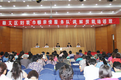 为进一步提高顺义区“巾帼亲情服务队”的服务能力,顺义区妇联联合区司法局、法院针对“巾帼亲情服务队”队员的调解能力进行培训。2013年上半年共开展培训11场,3000余名队员参加。培训邀请法院调解处法官、人民调解委员会的副主任等专业人士进行授课,内容涵盖法律法规(包括妇女权益保障法、继承法等)、婚姻家庭关系调适(包括夫妻、婆媳、亲子关系处理)、邻里纠纷调解(土地法、村规民约等)以及沟通技巧、调解技巧等。通过培训,切实提高了广大服务队员解决问题、化解矛盾的能力,使服务队员真正成为群众诉求的“代言人”、化解矛盾的“融化器”、政府和群众之间的“连心桥”。