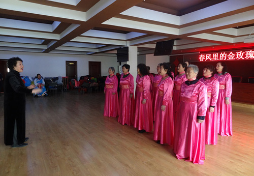志愿者组织中老年妇女排练节目