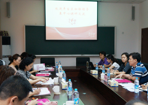 参观结束后,双方进行了座谈交流,北京市妇女儿童社会服务中心领导结合调研团所要了解的有关问题,全面介绍了北京市妇女儿童社会服务中心的总体规划、区域功能、服务理念、职能定位以及建设发展等方面情况,同时就构建北京市妇女儿童社会服务机构联动协作机制相关工作与对方交换了意见。丰台区妇联主席姜萍简要地介绍了丰台区妇女儿童培训中心的建设发展设想,希望借助市妇联在开展妇女儿童中心工作方面的经验和做法,进一步完善区妇女儿童中心的建设。同时双方就如何建设和管理好妇女儿童中心的问题进行了交流和讨论。调研团一行深感此行收获丰富,并对下一步妇女儿童中心的规划和建设,开展家政服务、巧娘培训和儿童教育等方面的工作有了更明确的目标和定位。