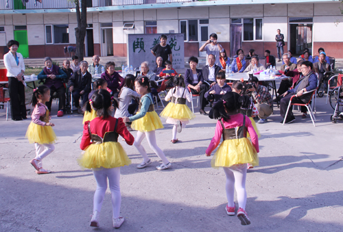 通州区书法协会会员徐永才先生专门为老人们挥毫泼墨,将两幅写着“寿”、“夕阳红”的书法作品赠送给老人。区政协委员、宋庄镇巾帼致富女带头人韩金平还为老人们带来了慰问品。随后,陶乐思幼儿园的小朋友还为老人们带来了精彩的节目并为老人送上重阳糕,宋庄镇的巾帼志愿者们为老人打扫房间、清洗衣服被褥、理发。看到老人们写满沧桑的脸上洋溢着欢笑和欣慰,在场的人都被这一温暖的情景感动着。