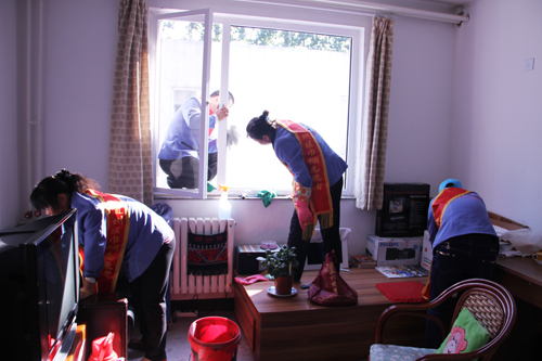 巾帼志愿者为老人打扫房间