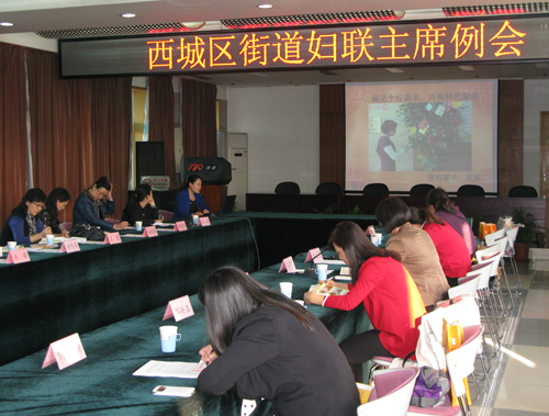 10月16日,西城区妇联召开街道妇联主席例会。会议由区妇联副主席吴秀丽主持,区妇联领导班子、中层干部及街道妇联主席参加了会议。例会分两部分进行,参会人员首先参观了金融街街道和广内街道的商务楼宇姐妹驿站,听取了这两个街道妇联主席对商务楼宇姐妹驿站建设情况的介绍。随后在会议阶段,各街道妇联主席汇报了2013年的暑期青少年活动开展情况,并就商务楼宇姐妹驿站建设和未成年人思想道德建设工作中好的经验做法以及存在的问题不足进行了交流沟通。区妇联主席李高霞在讲话对各街道妇联紧密结合街道特点、积极创新工作思维和方式方法、创造性地开展商务楼宇姐妹驿站建设和未成年人思想道德建设工作给予了肯定,并就今后工作提出了要求。
