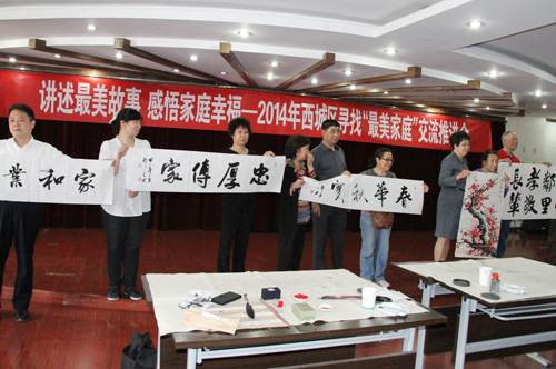 今年三月以来,西城区妇联在全区范围内开展了寻找“最美家庭”活动,以255个社区“妇女之家”为阵地,广泛开展“最美家庭”的推荐、互荐、互评互议。截至目前,共涌现出夫妻和睦、尊老爱幼、科学教子、勤俭持家、无私奉献的优秀家庭典型81户。推进会上,播放了天桥街道寻找“最美家庭”的视频短片,来自大栅栏、新街口和白纸坊街道的“最美家庭”代表进行了各自家庭故事的宣讲。市书协的书法名家们现场挥毫泼墨,书写家规家训格言,赠送给“最美家庭”代表,勉励他们继续传承中华传统家庭美德、弘扬良好家风。天桥街道的“最美家庭”代表向全区广大家庭发出倡议,号召大家崇德修身,做传统文化的传播者;担当责任,做最美家庭的践行者;承担社会义务,做社会和谐发展的推动者。活动现场还展出了区妇联为此次活动制作的15块展板,以图文并茂的形式展现了西城区“最美家庭”的风采。