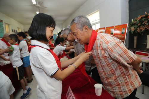 铭记历史 感恩老兵 少先队员为老兵佩戴红领巾
