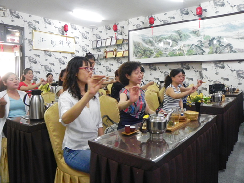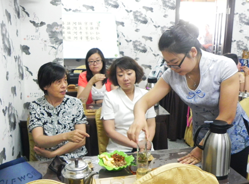 培训班上,二十余张古香古色的木质条案上摆放着精美的茶具,墙上“和”“静”“怡”“真”四个大字营造出安宁沉静的气氛。灵之秀的茶艺师详细讲解了中国传统的茶文化,包括茶的起源、种类、每种茶的制作及效用,正确的泡茶方法等,还现场进行了优美的茶道表演。女园长们边听边记,在茶艺师的指导下,亲手冲泡出一杯杯清香的黄芩茶,并互相品茶、交流。活动一方面让大家感受到中国传统茶文化的深刻内涵,另一方面也促进了园长间的相互交流和沟通,对提升女园长们内在修养起到了积极作用。