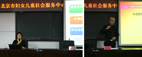 此次培训邀请了北京电视台《第三调解室》主编周潇和西城区人民调解员协会副会长、《第三调解室》调解员、北京电视台《生活广角》栏目首席调解员刘跃新给大家讲授。首先周潇主编介绍《第三调解室》运作模式,随后刘跃新老师用几个典型的案例讲解相关的法律知识、学会找准在不同的家庭矛盾中,运用正确的方式方法,如排除妨碍法、唤醒亲情法等。在第二天的培训中,又邀请了北京市西城区心理健康服务中心主任、《第三调解室》特邀心理专家邵然分析了现在的社会存在的不同压力和如何缓解压力,特别是作为一名心理服务志愿者,如何正确地帮助那些有困难的妇女儿童。