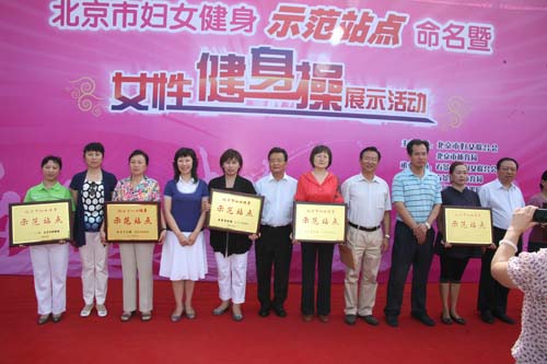 8月27日上午,北京市妇联、北京市体育局在全国妇女健身示范站点---石景山区海一社区海特广场联合举办“北京市社区妇女健身示范站点命名和女性健身操展示活动”,命名东城区海运仓社区健身站等100个妇女健身站点为北京市妇女健身示范站点。