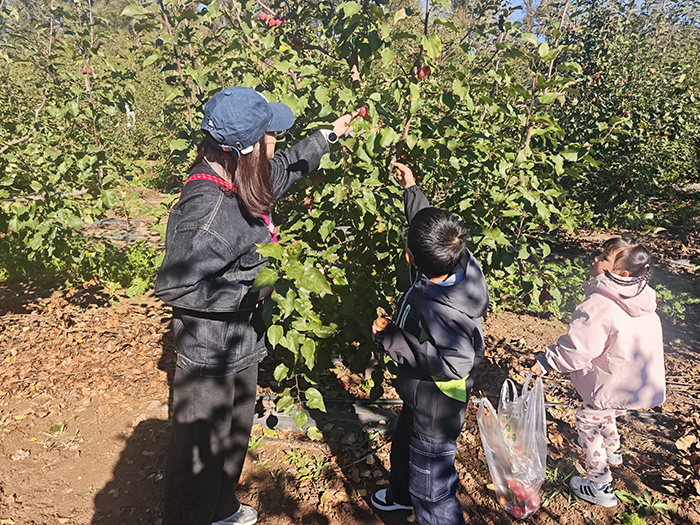 活动中,延香海棠园工作人员借助实物展示向亲子家庭科普了海棠树萌芽、开花、挂果的完整生长周期,介绍了园区主栽品种抗病性强、耐储存等品种优势及营养价值。随后,工作人员现场指导孩子们如何辨认海棠果是否成熟,讲解采摘技巧并耐心示范,提醒孩子们采摘时避免损伤树枝,以免影响果树的成长。采摘环节,家长与孩子分工协作,孩子们雀跃着、模仿着工作人员的动作,小心翼翼地握住果实、轻掰果柄,将一颗颗“八棱脆”海棠果收入袋中。