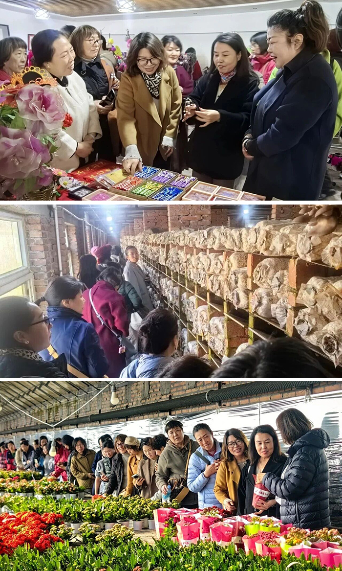 西城巧娘走进昌平区巧妇协会手工艺展示区,围绕葫芦烙画、手工编织、非遗头饰等作品,两地巧娘交流技法、互授经验。随后赴北京谷氏农业专业合作社菌菇种植大棚,大家学习菌菇种植技术,围绕“手工艺+农产品包装”“菌菇元素文创开发”方向,借鉴其“农业+帮扶”带动妇女就业模式。在北京昊景卉丰农业科技有限公司负责人带领大家实地参观长寿花生产基地、品种培育车间及自动化控制设备,详细介绍了花卉培育、产业发展,“花卉美学+手作设计”合作模式,部分巧娘已初步构想出花卉主题手作开发相关方案。
