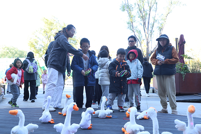 本次活动创新采用“集-散-集”打卡模式,结合广阳谷城市森林公园与广阳书院的空间特色,设置五大趣味互动环节,实现自然科普与亲子互动深度融合。在老鹰雕塑旁的自然科普寻宝现场,孩子们按照工作人员发的打卡地图,探索公园地貌与植被奥秘,通过完成寻宝任务深化对生态保护的认知;广阳书院阶梯教室内,热转印笔袋制作活动兼具创意与实用性,孩子们绘制的公园美景经转印技术定格为专属纪念,让环保理念融入日常生活;西广场的九宫格足球挑战与大树下的圈圈套摇头鹅游戏充满竞技乐趣,亲子默契配合完成挑战,在欢声笑语中培养协作意识;北广场的降速伞体验环节动感十足,小朋友们系伞奔跑间感受科学原理,尽情释放童真活力。快乐童年