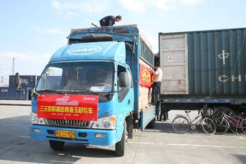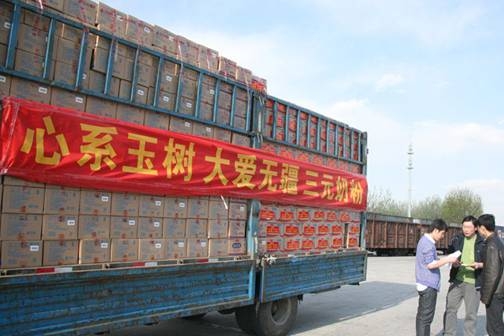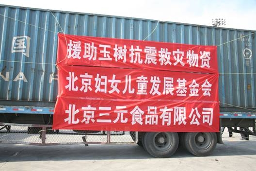 4月23日下午,由北京三元食品股份有限公司捐赠给北京妇女儿童发展基金会的总价值100万元援助玉树的奶粉从北京大红门货运站启程发往灾区。载满救灾援助物资的专列将日夜兼程火速运往灾区,为玉树的儿童们送去来自首都的关爱。