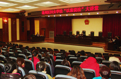 自2010年以来,通州区妇联在区法院的支持下定期开设了多期“以案说法”大讲堂,其目的是通过观摩现场庭审,结合专家以案说法,加大妇女维权工作力度,强化妇联干部和妇女维权志愿者维权意识,不断提高维权的能力和水平,为建立社会化妇女维权体系奠定基础。“以案说法”大讲堂活动已成为通州区妇联维权工作的品牌,得到了越来越多妇女群众的认可与欢迎。