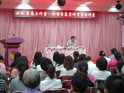 根据市妇联《关于开展“和谐家庭宣传月”活动的通知》要求,东城区妇联5月25日在崇文区第三幼儿园举办了“女性·家庭大讲堂”--和谐家庭宣讲月活动。讲座聘请北京青年报常务副总编田科武以《培养孩子自尊自信的关键和禁忌》为主题,为家长生动讲解了培养孩子自信的9个关键因素和9个禁忌,受到了家长和幼儿园教师的欢迎。全区共100多名家长和老师参加了讲座。
