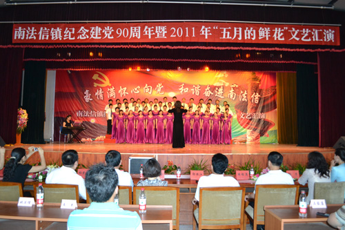 5月31日,顺义区南法信镇妇联庆祝建党90周年暨2011年“五月的鲜花”文艺汇演在北法信村剧场举行。各村、居委会以及机关、企事业单位的260余名文艺爱好者欢聚一堂,以绚丽多彩的节目为建党90周年献礼。